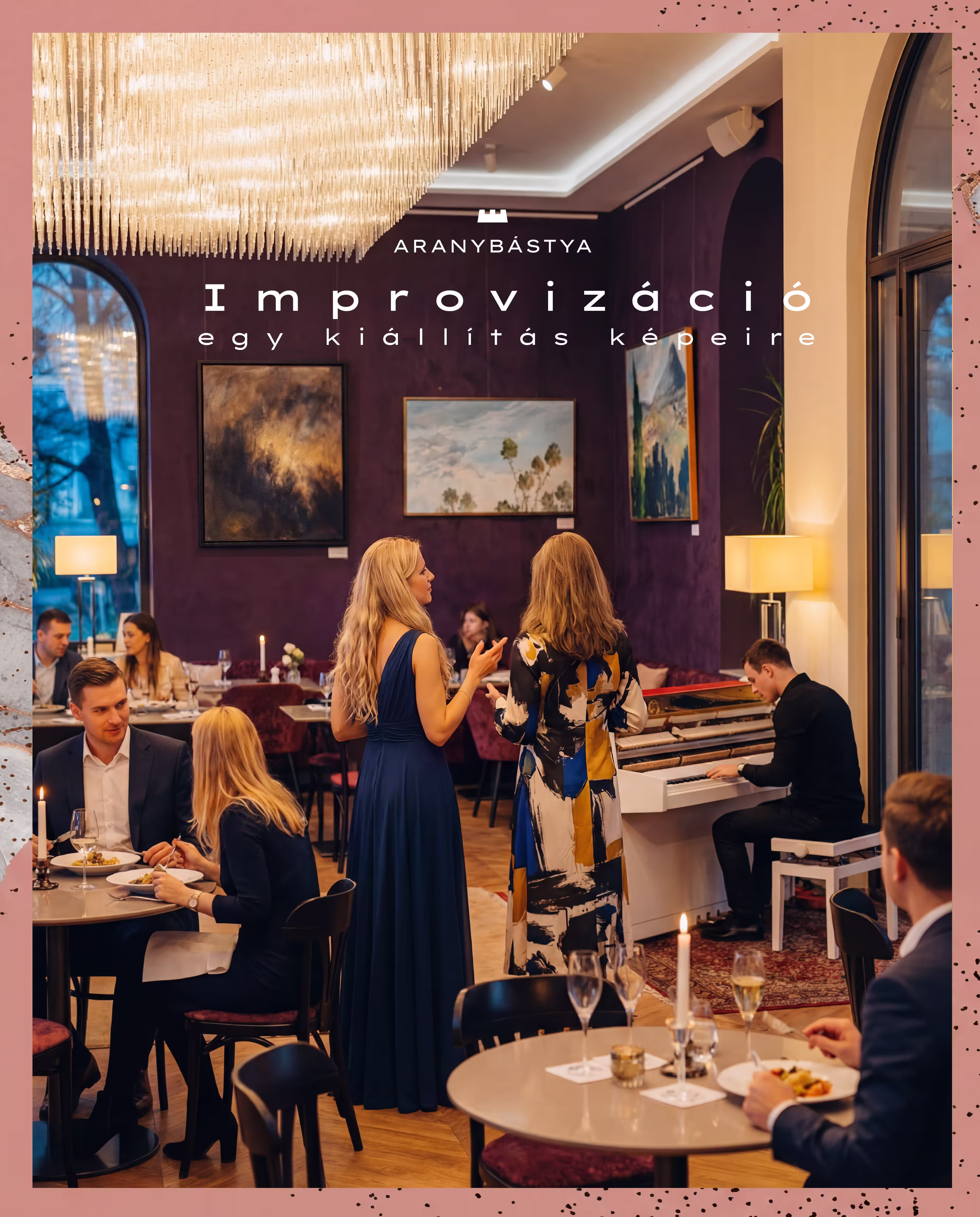 The auction sale of the painting serves charitable purposes. In the autumn of 2022 our guests could create on the canvas placed at the entrance of the Aranybástya restaurant. The aim of the project was to sell the work at a charity auction, offering the ammount to the Pál Zsótér Foundation. The painting is approved by a Hungarian art historian. Alexandra Hegedűs, a young visual artist currently exhibiting at the restaurant, provided the basic motif on the canvas, after which the guests continued the painting according to their own taste. The finished work has an eclectic, unique style.